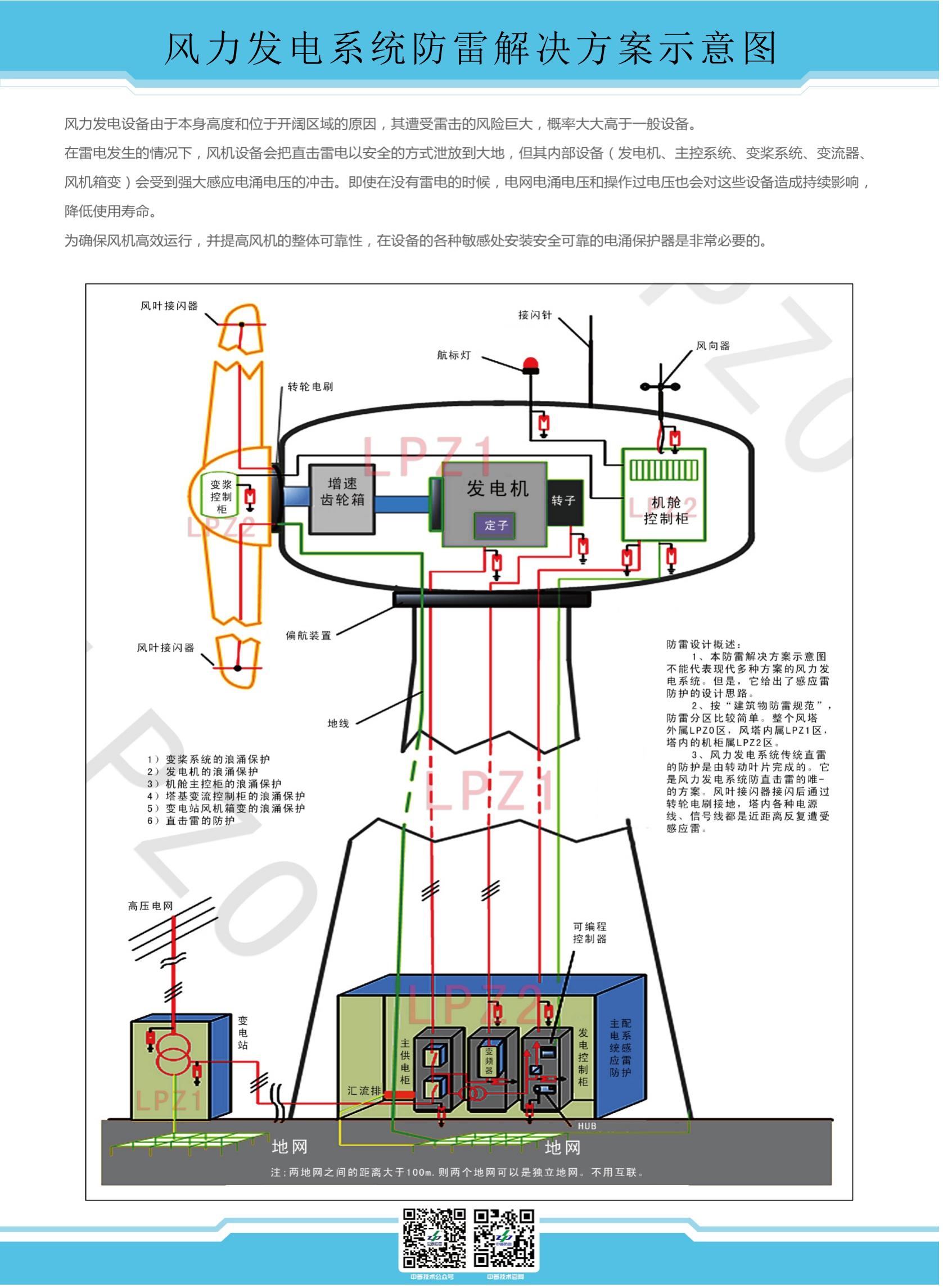 風(fēng)機(jī)內(nèi)部集成了大量的電氣,電子設(shè)備,例如:主控柜,動(dòng)力柜、信號(hào)柜、發(fā)電機(jī),驅(qū)動(dòng)裝置,變頻器,傳感器,以及相應(yīng)的總線系統(tǒng)等。這些設(shè)備集中在一個(gè)狹小的區(qū)域里,電涌都會(huì)給風(fēng)機(jī)機(jī)組帶來嚴(yán)重的損壞。保障這些電氣裝置的正常工作是非常重要的,雷電流耦合或開關(guān)操作引起的過電壓在這些裝置上都會(huì)導(dǎo)致嚴(yán)重?fù)p壞,引起整個(gè)風(fēng)機(jī)的停機(jī)。因此,風(fēng)機(jī)的雷電和過電壓保護(hù)非常重要。