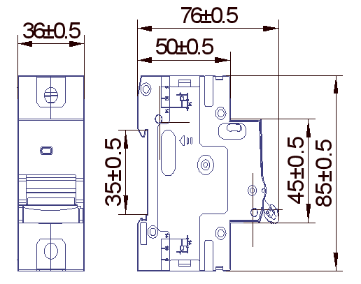 產(chǎn)品采用 35mm 標(biāo)準(zhǔn)導(dǎo)軌安裝,單模尺寸為:76×85×36(mm),未標(biāo)注公差:±0.5mm。如下列圖所示(單位:mm):