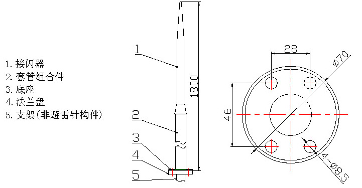 當(dāng)DXH06‐P/1.8B 型避雷針受雷擊時(shí),由接閃器接閃,并將雷電流疏導(dǎo)入地。其結(jié)構(gòu)能抑制由于接閃器接閃引起的對(duì)被保護(hù)物的側(cè)擊。